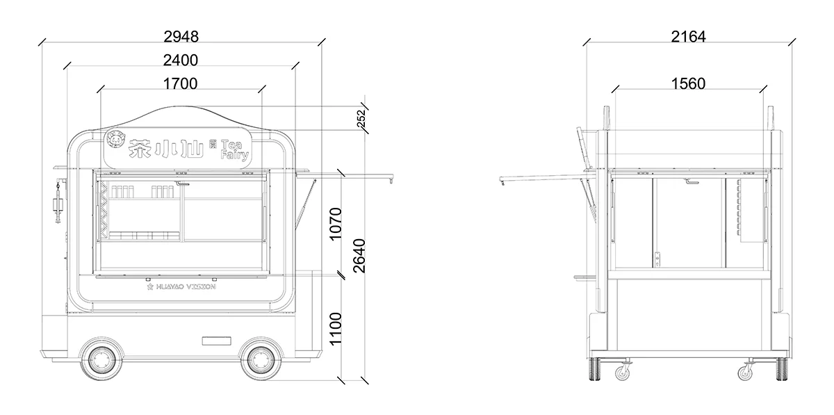 Magnitudines productae sunt maxime 4-m in longitudine (pro missionibus ad potum negotii idoneae), cum fenestra venditio paribus cum tabula operationis plicatili, umbracula et conopeum pluviae, et colluvies pulveris probationis attentis commoditatis ordinandi, mixtionis, prandiorum legendi. Potionem fixam cum thesauris comparatis, valde redditum, ornamentum, ac bona pecuniaria servat, ac molliter operans puncta secundum mutationes fluxum transeuntium, variis missionibus accommodans sicut mane ruunt hora commutandi, tea postmeridiana, mercatus nocturnus et spectacula. Iuvat celeriter ad mercaturam emptoris capiendam et praelatus apparatus pro minima entrepreneurship, notam pop-ups, et missionem munerum potus
